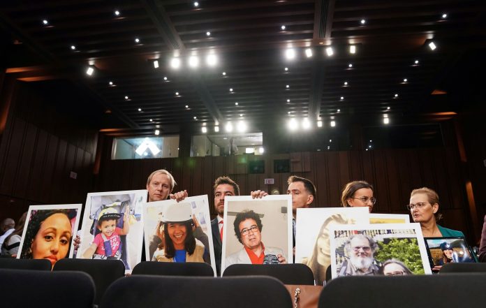 Family members hold photographs of Boeing 737 MAX crash victims lost in two deadly 737 MAX crashes that killed 346 people as Boeing CEO Dennis Muilenburg testifies before a Senate Commerce, Science and Transportation Committee hearing on “aviation safety” and the grounded 737 MAX on Capitol Hill in Washington, October 29, 2019.