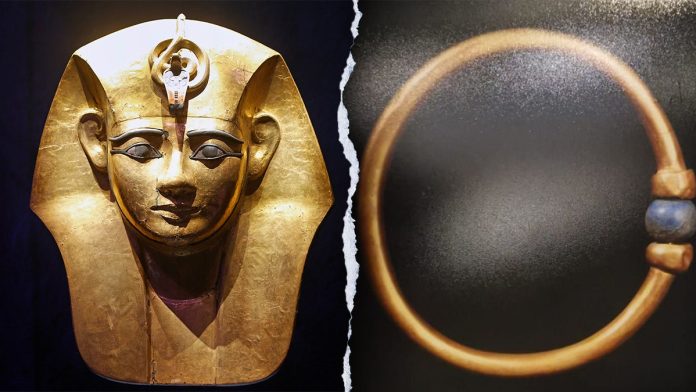Egyptian authorities recently announced the theft of a gold and lapis lazuli bracelet once owned by Pharaoh Amenemope. (Chesnot/Getty Images; Egyptian Ministry of Tourism and Antiquities)